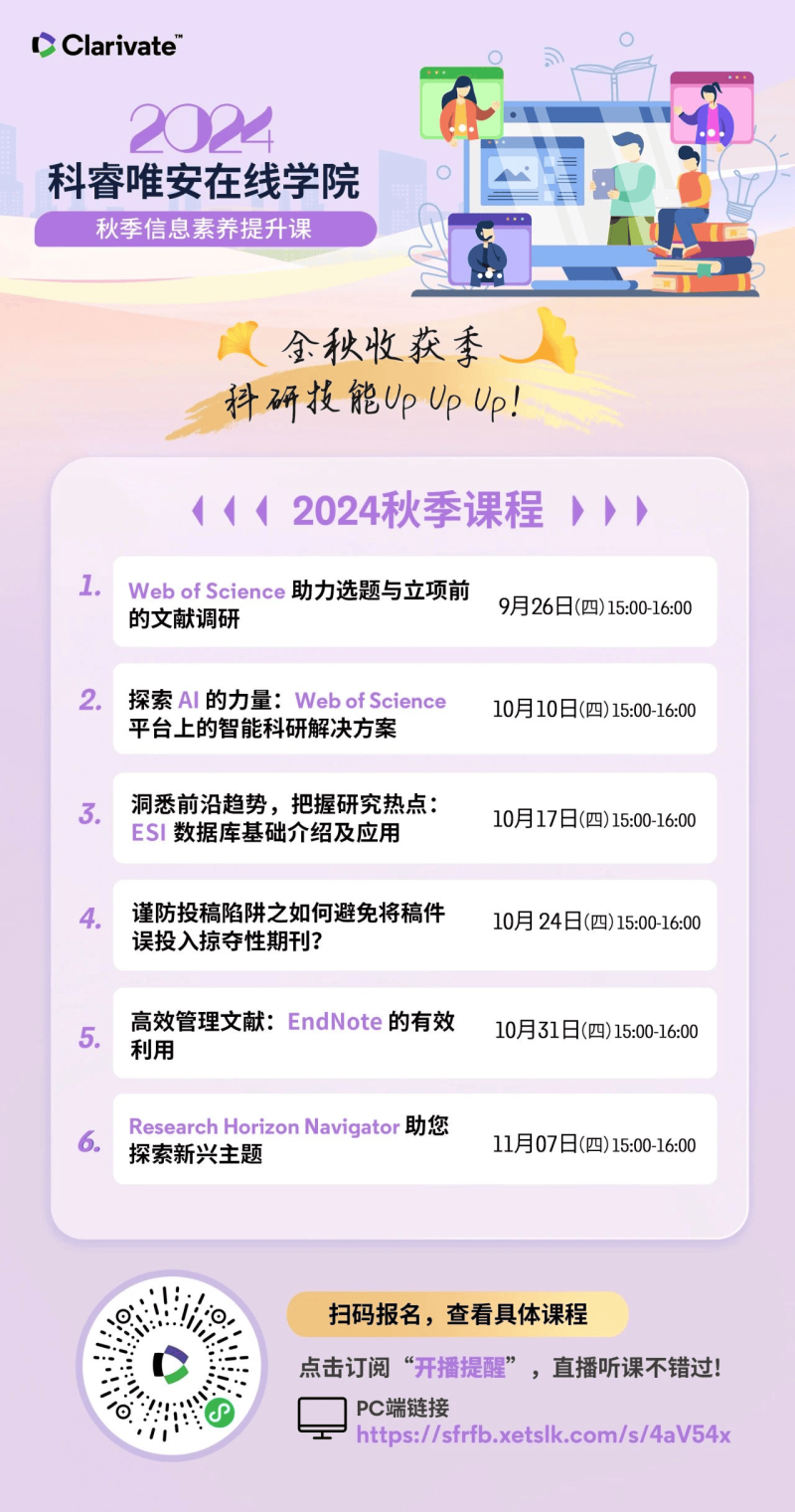“2024秋季课程”如期而至~本期课程除了会介绍经典的 Web of Science、ESI、JCR、EndNote 等科研神器,还会带您了解今年上半年的新增功能,如:AI技术加持的 Web of Science 研究助手、InCites 平台新模块Research Horizon Navigator。